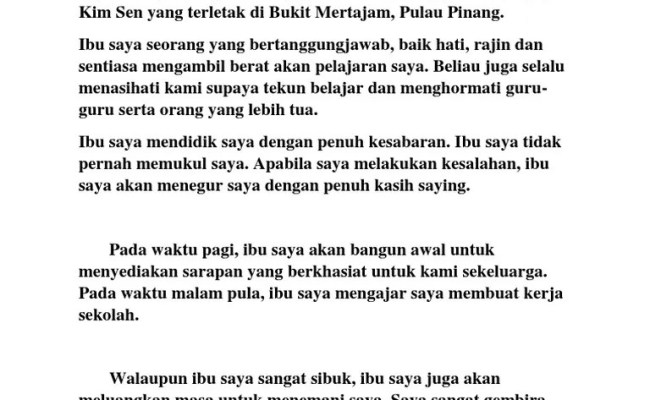 Bahasa Melayu Ibu Saya Karangan Tahun 4 - Modul 74 Contoh Latihan Karangan Bahasa Melayu Membalik Buku Halaman 1 50 Fliphtml5. Ujian pemahaman bahasa malaysia tahun 4 sjk. Tuliskan sebuah karangan biografi yang bertajuk "ibu saya". Nama ibu saya ialah jolin. Ibu saya merupakan insan paling istimewa dalam hidup saya. Janganlah kita menyakiti hati ibu. Ibu saya mengajarkan mata pelajaran bahasa melayu dan pendidikan jasmani. Beliau mengajar anak anak muridnya dengan penuh kesabaran agar mereka mendapat . Beliau berkulit cerah dan rambutnya panjang.